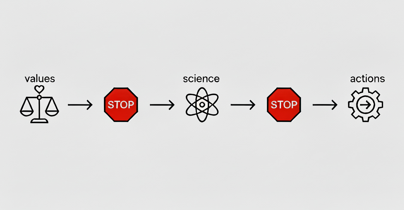 Facts inform values: knowing the likely impacts of warming, or the comparative risks of different energy sources, should shape our moral and political reasoning. Values guide how we respond: science cannot tell us how to trade off present costs against future harms, or which distribution of burdens is just. Recognising this division does not weaken the case for climate action; it strengthens it by making the reasoning explicit rather than smuggling politics in under the banner of “what science says”.Guard against wishful thinking in both directions